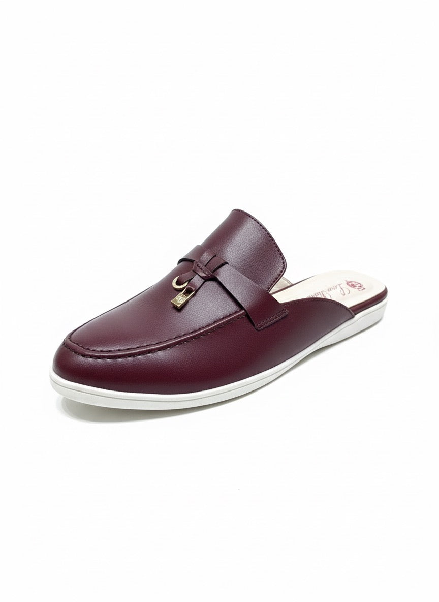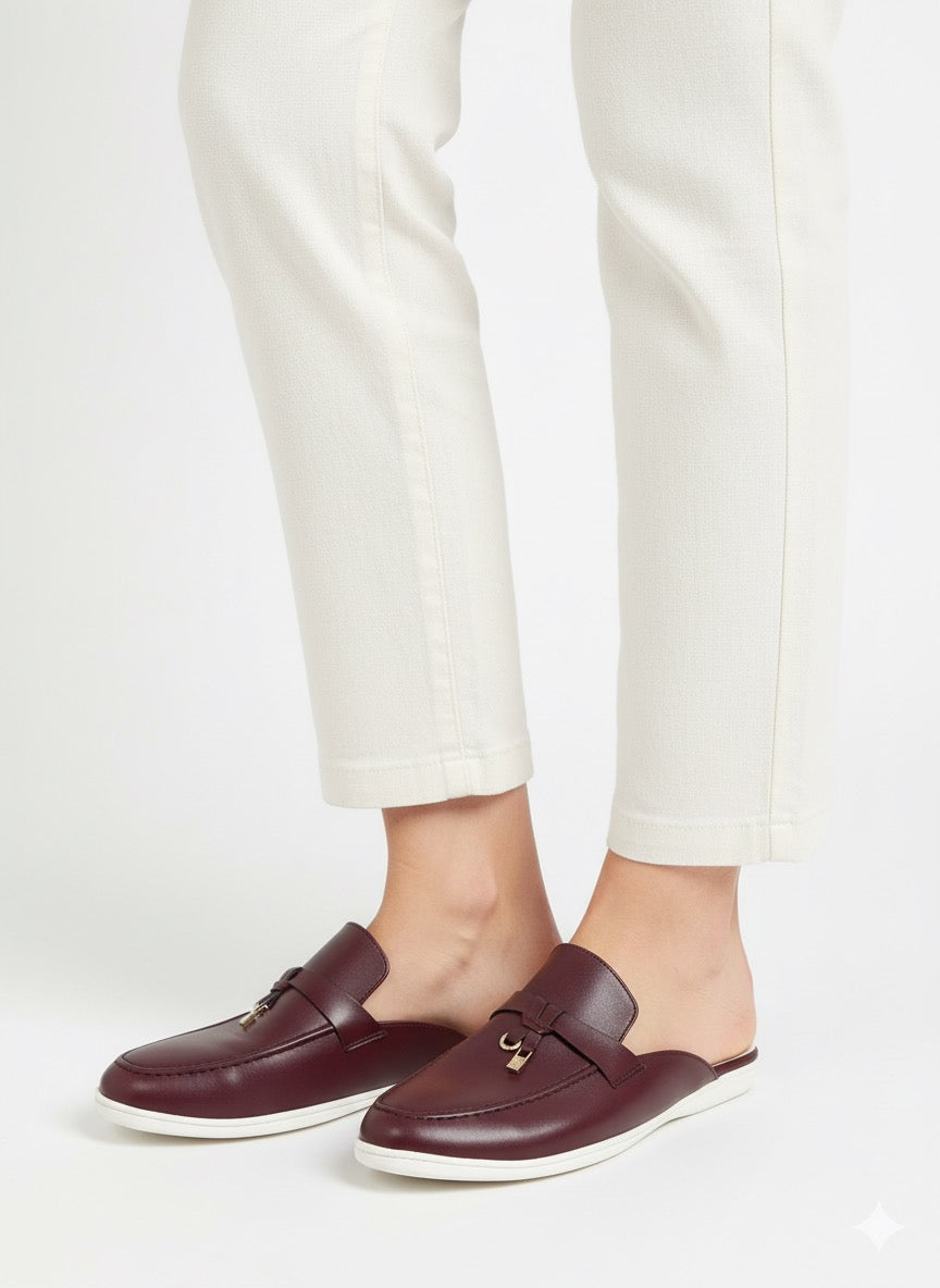 Mules femme en daim grenat, cuir suédé doux, talon plat / petit talon, bride large enveloppante. Élégantes et faciles à enfiler, parfaites pour un style chic-décontracté au quotidien.